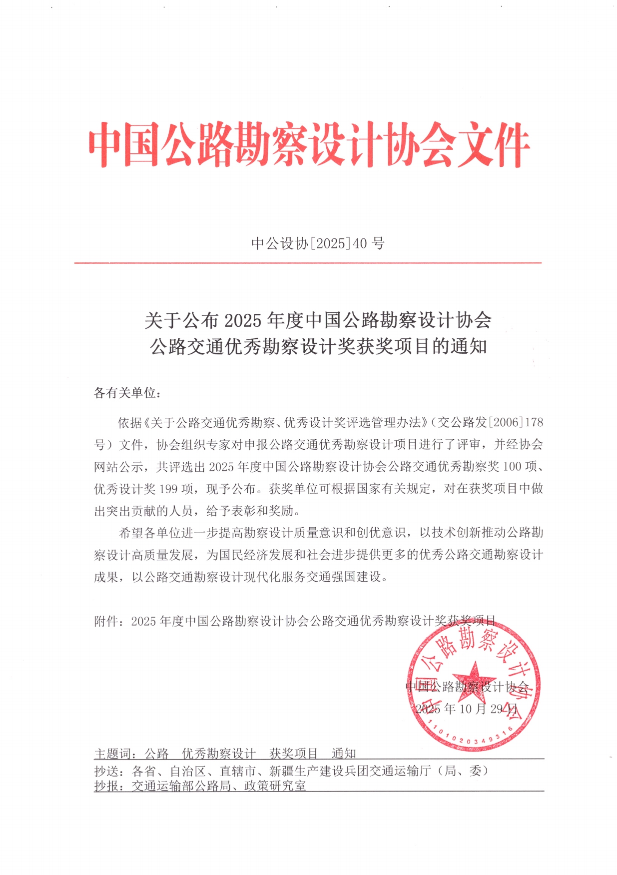 關于公布2025年度中國公路勘察設計協會公路交通優秀勘察設計獎獲獎項目的通知.pdf